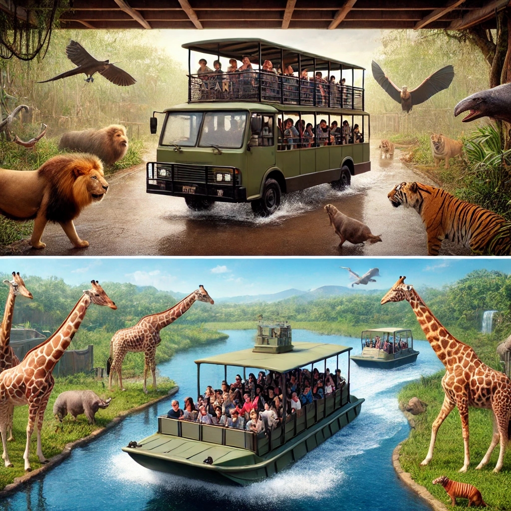 | 체험 요소 | 맹수들이 차량 근처까지 접근, 박력 있는 연출 | 기린 먹이 주기, 물 위를 이동하는 체험 |